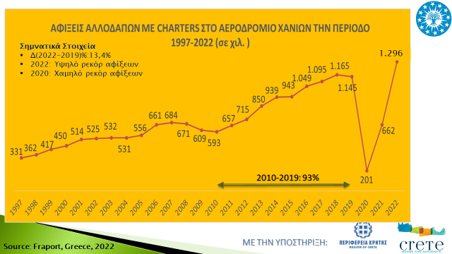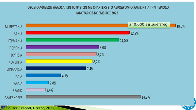 Σχετικά με τις αφίξεις αλλοδαπών τουριστών στο αεροδρόμιο Χανίων και με βάση τα πρόσφατα στοιχεία της Fraport-Greece για την περίοδο Ιανουάριος-Νοέμβριος 2022, καταγράφεται ρεκόρ αφίξεων με 1,3 εκατ. αφίξεις, σημειώνοντας αύξηση 13% σε σχέση με την αντίστοιχη περίοδο του 2019, όπου είχαν σημειωθεί 1,1 εκατ. αφίξεις, χρονιά προ κορονοϊού εποχή.