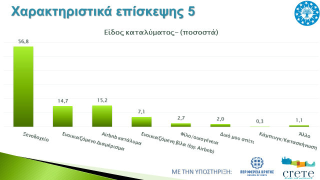 Αυξημένο είναι επίσης το ποσοστό των αλλοδαπών τουριστών που προτιμούν τις βραχυπρόθεσμες ενοικιάσεις τύπου Air BnB, αφού περίπου ένα 15% των επισκεπτών επιλέγει να διαμένει σε τέτοια καταλύματα. Τα ξενοδοχεία, αν και ελαφρώς μειωμένα σε ποσοστά, παραμένουν στην πρώτη θέση των προτιμήσεων των τουριστών, με πάνω από τους μισούς από αυτούς να τα επιλέγουν, ενώ σχεδόν δύο στους τρεις τουρίστες προτιμούν πολυτελή ξενοδοχεία 4 & 5 αστέρων, ενώ το ποσοστό αυτών που επιλέγουν ενοικιαζόμενα διαμερίσματα/δωμάτια έχει πέσει στο 15%.