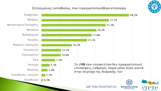 Αναφορικά με τις τοποθεσίες που επέλεξαν οι επισκέπτες φαίνεται ότι προτιμούν τις παραλίες κυρίως του Ελαφονησίου αλλά και αυτές των Μπάλου και Φαλασάρνων, ενώ εξίσου σημαντικός αριθμός τουριστών πραγματοποιεί επισκέψεις σε μοναστήρια και εκκλησίες, μουσεία και αρχαιολογικούς χώρους, κυρίως της Κνωσού. Παρατηρείται ότι οι δύο εμβληματικές παραλίες του Νομού Χανίων, όπως είναι του Ελαφονησίου και του Μπάλου είναι στις πρώτες επιλογές των αλλοδαπών τουριστών και κρίνεται απαραίτητη η αειφορική διαχείριση των προορισμών αυτών, δεδομένου του πολύ μεγάλου αριθμού αφίξεων αλλοδαπών τουριστών. Αξίζει να σημειωθεί ότι ένας στους τέσσερις επισκέπτες δεν πραγματοποιεί επισκέψεις/εκδρομές παρά μόνο πολύ κοντά στην περιοχή διαμονής του.