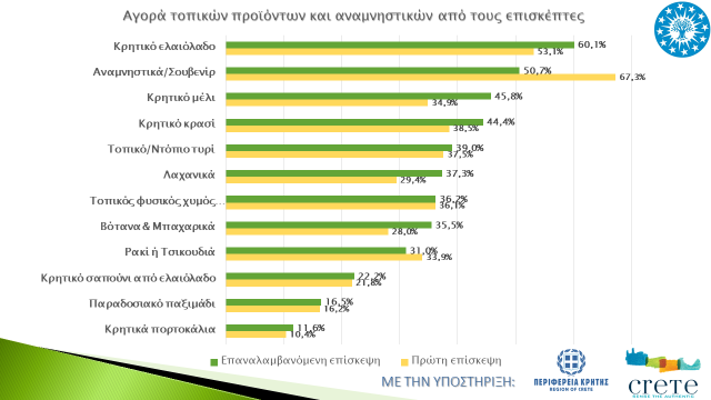 Σχετικά με τα τοπικά αγροτικά προϊόντα, ο αλλοδαπός τουρίστας μένει πολύ ικανοποιημένος από τα τοπικά χαρακτηριστικά των προϊόντων αυτών, ενώ προβαίνει και σε αγορά αυτών με το ελαιόλαδο, το κρασί, το μέλι, τα τοπικά τυριά, τα λαχανικά, τον φυσικό χυμό πορτοκαλιού, τα βότανα/μπαχαρικά και το ρακί/τσικουδιά να συνεχίζουν και φέτος να προτιμώνται περισσότερο από τους αλλοδαπούς τουρίστες, ενώ ιδιαίτερη δυναμική παρουσιάζουν φέτος το κρητικό μέλι καθώς και τα φαρμακευτικά & αρωματικά φυτά.