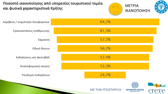 Οι αλλοδαποί τουρίστες συνεχίζουν να εκφράζουν τη δυσαρέσκεια τους σχετικά με την κακή κατάσταση του οδικού δικτύου και της σήμανσης, με μειωμένα όμως ποσοστά σε σχέση με τα προηγούμενα έτη, ενώ υπάρχει αισθητή βελτίωση στην καθαριότητα τόσο στον αστικό ιστό όσο και στις παραλίες, ωστόσο το σύστημα αποκομιδής και περισυλλογής απορριμμάτων χρήζει περαιτέρω αναβάθμισης, καθώς πραγματοποιείται έντονη χρήση πλαστικών κυρίως στην Πόλη των Χανίων.