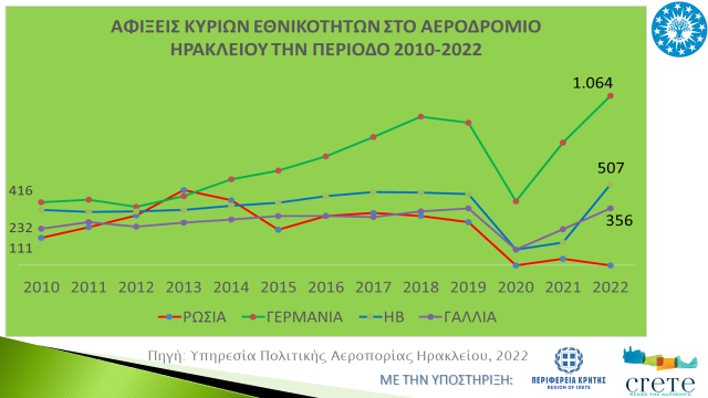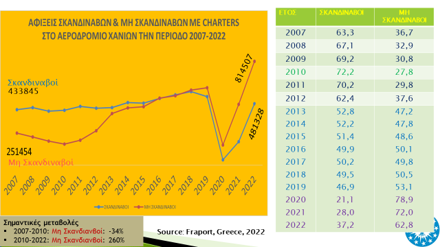 Η φετινή αύξηση, σε σχέση με το 2019, καταγράφεται από τις κύριες εθνότητες, όπως είναι οι Γερμανοί με 68%, Βρετανοί με 30%, Πολωνοί με 20% και Δανοί με 17%. Ενθαρρυντική είναι επίσης, η αύξηση των Ιταλών και Γάλλων με ποσοστά 200% και 90% αντίστοιχα, όπου δείχνουν ότι επανακάμπτουν. Αντίθετα, σημαντικές είναι οι μειώσεις των Αυστριακών με 23% και Κυπρίων, Βέλγων και Ολλανδών με ποσοστά κοντά στο 14%, ενώ ανησυχητικές είναι πτώσεις των αφίξεων που καταγράφουν οι Νορβηγοί με 30% και Σουηδοί με 21%, οδηγώντας σε μια συνολική μείωση των Σκανδιναβών τουριστών κατά 10% τη φετινή χρονιά σε σχέση με το 2019. Έτσι, ενώ το διάστημα 2013-2019, το ποσοστό των Σκανδιναβών ήταν γύρω στο 50% επί του συνολικού ποσοστού αφίξεων, φέτος το ποσοστό διαμορφώνεται κοντά στο 37%.