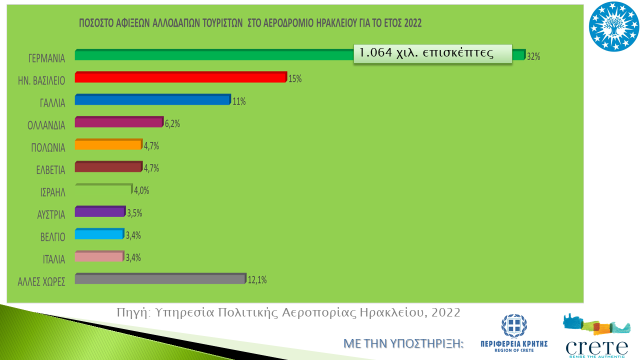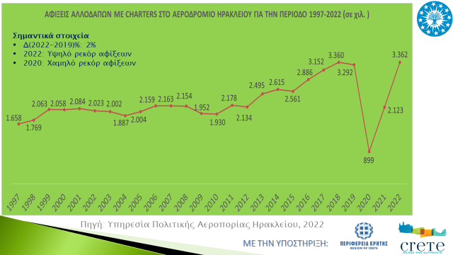 Αναφορικά με τις αφίξεις αλλοδαπών τουριστών στο αεροδρόμιο Ηρακλείου και με βάση τα στοιχεία της Υπηρεσίας Πολιτικής Αεροπορίας Ηρακλείου, για το έτος 2022, καταγράφεται ρεκόρ αφίξεων, της τάξεως των 3,4 εκατ. αφίξεων, σημειώνοντας αύξηση κατά 2% σε σχέση με τις αφίξεις της αντίστοιχης περιόδου του 2019, προ κορονοϊού εποχής.