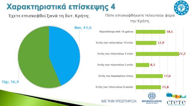 Συγκριτικά με τα προηγούμενα έτη, προ εποχής κορονοϊού, φέτος καταγράφεται αυξημένο το ποσοστό των αλλοδαπών τουριστών που επισκέπτονται τη Δυτική Κρήτη για πρώτη φορά, κυρίως λόγω της μειωμένης έλευσης Νορβηγών και Σουηδών τουριστών, που παραδοσιακά είναι αυτοί που προτιμάνε να ξανα-επισκέπτονται τον συγκεκριμένο προορισμό, με πάνω από τους μισούς αλλοδαπούς τουρίστες να επισκέπτονται τη Δυτική Κρήτη για πρώτη φορά. Αντίθετα, αυτοί που έχουν ξαναεπισκεφθεί τη Δυτική Κρήτη στο παρελθόν, το ένα τρίτο δήλωσε ότι την τελευταία φορά που ξαναεπισκέφθηκε την περιοχή ήταν έως πριν ένα μόλις έτος.