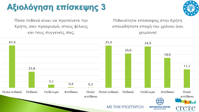Σχεδόν όλοι οι αλλοδαποί τουρίστες δηλώνουν ότι έμειναν από πολύ έως πάρα πολύ ικανοποιημένοι από την επίσκεψη τους στην περιοχή, ενώ εννέα στους δέκα αλλοδαπούς τουρίστες όχι μόνο θα επιθυμούσαν να ξαναεπισκεφθούν τη Δυτική Κρήτη αλλά θα το σύστηναν ανεπιφύλακτα σε συγγενείς και φίλους, γεγονός που αναδεικνύει και την ελκυστικότητα του τόπου. Επίσης, σχεδόν οι μισοί αλλοδαποί επισκέπτες δηλώνουν ότι θα επισκέπτονταν την περιοχή και κατά τη διάρκεια της χειμερινής περιόδου αν υπήρχε απευθείας ανταπόκριση από την πόλη τους, γεγονός που αναδεικνύει τη δυναμική του προορισμού και κατά τη χειμερινή περίοδο.