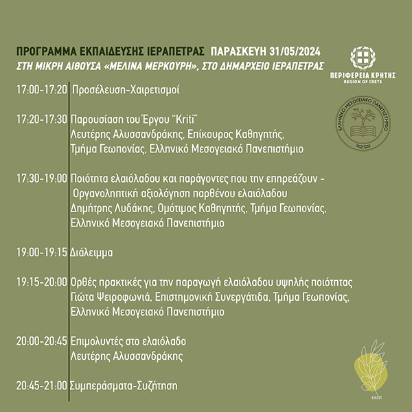 Η Περιφέρεια Κρήτης και το Ελληνικό Μεσογειακό Πανεπιστήμιο, σε συνεργασία με το Δήμο Ιεράπετρας, διοργανώνουν εσπερίδα για την ποιότητα του Εξαιρετικού Παρθένου Ελαιόλαδου «Kriti» η οποία θα πραγματοποιηθεί την Παρασκευή 31 Μαΐου 2024, στις 17:00, στην Μικρή Αίθουσα «Μελίνα Μερκούρη» στο Δημαρχείο Ιεράπετρας.