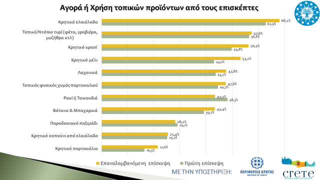 Σχετικά με τα τοπικά αγροτικά προϊόντα, ο αλλοδαπός τουρίστας μένει πολύ ικανοποιημένος από τα τοπικά χαρακτηριστικά των προϊόντων αυτών, ενώ προβαίνει και σε αγορά αυτών με το ελαιόλαδο, τα τοπικά τυριά, το κρασί, το μέλι, τα λαχανικά, τον φυσικό χυμό πορτοκαλιού, την τσικουδιά και τα βότανα/μπαχαρικά να συνεχίζουν και φέτος να προτιμώνται περισσότερο από τους αλλοδαπούς τουρίστες, ενώ ιδιαίτερη δυναμική παρουσιάζουν φέτος τα τοπικά τυριά.  Μάλιστα, ένα αξιοσημείωτο στοιχείο είναι ότι η πλειοψηφία των τουριστών που έχουν ήδη ξαναεπισκεφθεί τη Δυτική Κρήτη αγοράζουν περισσότερο τα τοπικά αγροτικά προϊόντα από ότι οι τουρίστες που επισκέπτονται την περιοχή για πρώτη φορά, γεγονός που αναδεικνύει την εμπιστοσύνη που δείχνουν οι επισκέπτες στα Κρητικά ποιοτικά αγροτικά προϊόντα.