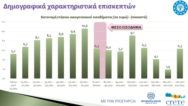 Ο μέσος όρος του εισοδηματικού τους επιπέδου παραμένει πολύ υψηλός στα 80.000 ευρώ, κυρίως λόγω  της αύξησης των αλλοδαπών τουριστών που προέρχονται από χώρες της Αμερικής, Καναδά και Αυστραλίας, οι οποίοι είναι και πολύ υψηλού εισοδηματικού προφίλ. Αξιοσημείωτο είναι το γεγονός ότι σχεδόν το 1/3 των επισκεπτών στην περιοχή μας δηλώνει εισόδημα πάνω από 100.000 €.